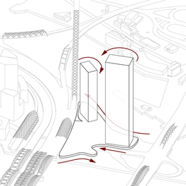 Der Entwurf sieht zwei miteinander verbundene Türme auf einer 9.5m hohen Basis vor. Diese ist niedriger als die benachbarte neue Bahnstation, aber immernoch über der zu beachtenden Hochwassergrenze. Auf diese Weise wird der Entwurf bewusster wahrgenommen, da man auf die Plaza herunter oder über die großzügig angelegten im Norden und Süden herauf gehen muss. Die großzügigen Stufen laden zum Treffen und Entspannen ein, oder bieten sogar die Möglichkeit und den Platz für Open-Air-Konzerte am Wasser an warmen Sommertagen.